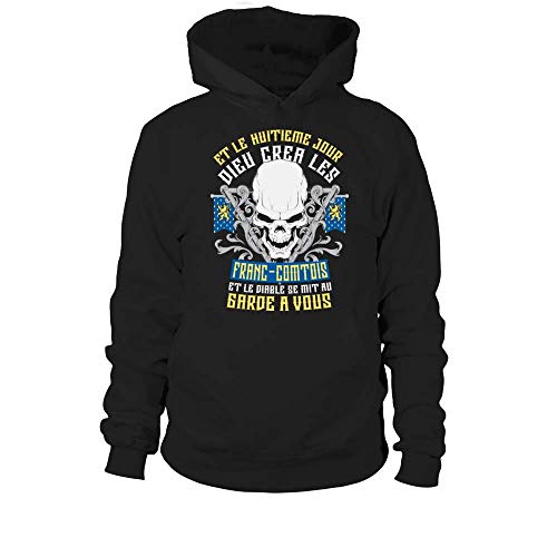 PRODUIT : Et le 8ème jour Dieu créa les Franc-Comtois et le Diable se mit au garde à vous. , Sweat à capuche de Teezily, Manches longues, Coupe classique, Col rond, Taille : S M L XL XXL 3XL, Sweat à capuche Unisex , Tissu de qualité supérieur. QUI SOMMES-NOUS : Teezily est une plateforme qui propose à des particuliers de concevoir et vendre des produits personnalisés. Retrouvez des t-shirts originaux à imprimé graphique, des sweatshirts, des mugs, et autres types de vêtements et accessoires. Teezily donne la parole aux créateurs pour imaginer des designs uniques ENTRETIEN : Lavable en machine conformément à l’étiquette d’entretien, Repasser sur l’envers pour ne pas détériorer le design, Eviter de trop tirer sur le vêtement lors du repassage. À PROPOS DU PRODUIT : Sweat à capuche agréable au toucher, Idéal pour un cadeau original et personnalisé, Se porte avec tout! Matière : 50% Coton 50% Polyester . Livraison rapide